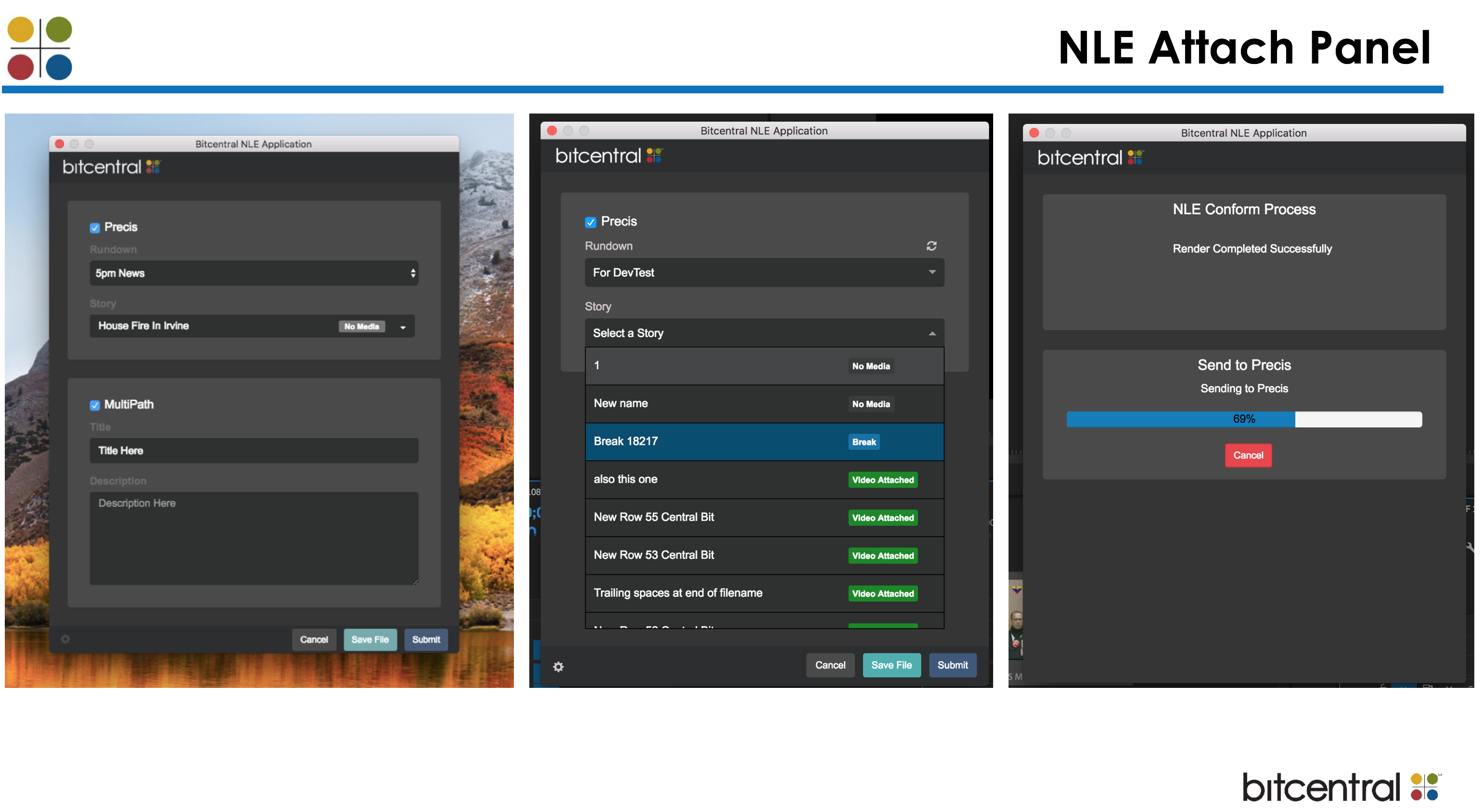The Bitcentral NLE Attach Panel is a multifunction tool used to attach timeline conformed videos to Newsroom NRCS MOS driven playout systems and Digital Distribution via our MultiPath publishing connector.