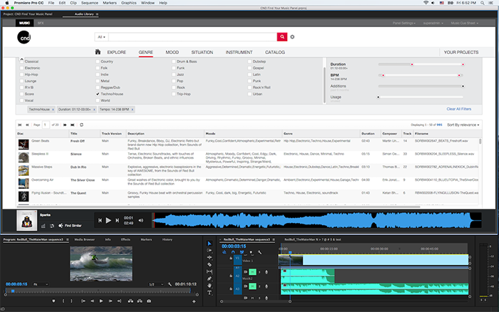 CND provides a managed service to search, audition, organize, share and download all production music, commercial music, sound effects and sound design in one sleek, modern interface right inside Adobe Premiere Pro CC. CND’s panel enables users to preview music in sync to picture before importing and to create cue sheets.