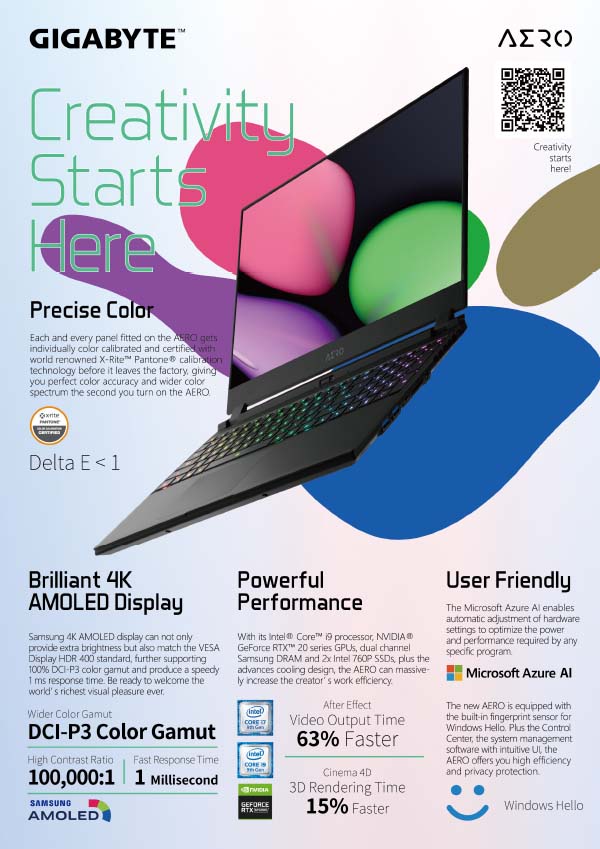 -Color accuracy: Each and every panel fitted on the AERO laptop gets calibrated with X-Rite™ Pantone® technology before it leaves the factory, giving you perfect color accuracy of Delta E < 1. -Visual: First laptop featuring AMOLED display with thin-bezel design. -Optimized performance: With the Microsoft Azure AI, users can have optimal performance without sacrificing mobility. -Premium components: Intel CPU, NVIDIA GPU, Samsung DRAM, Intel SSD, and more. -Made in Taiwan: The AERO series laptops are designed and made in Taiwan.