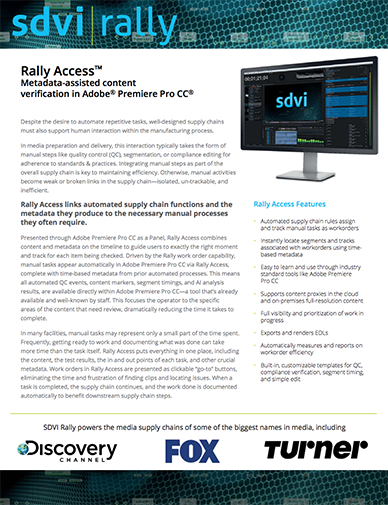 Rally Access links automated supply chain functions and the metadata they produce to the necessary manual processes they often require. Presented through Adobe Premiere Pro CC as a Panel, Rally Access combines content and metadata on the timeline to guide users to exactly the right moment for verification and editing.