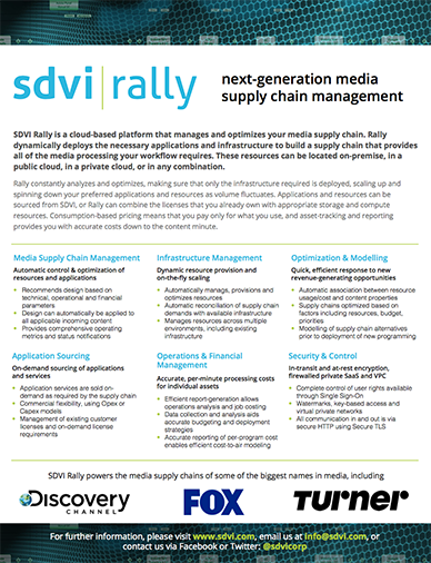 SDVI Rally is a cloud-based platform that manages and optimizes your media supply chain. Rally dynamically deploys the necessary applications and infrastructure to build a supply chain that provides all of the media processing your workflow requires. These resources can be located on premise, in a public cloud, in a private cloud, or in any combination. Rally constantly analyzes and optimizes, making sure that only the infrastructure required is deployed, scaling up and spinning down your preferred applications and resources as volume fluctuates. Applications and resources can be sourced from SDVI, or Rally can combine the licenses that you already own with appropriate storage and compute resources. Consumption-based pricing means that you pay only for what you use, and asset-tracking and reporting provides you with accurate costs down to the content minute.