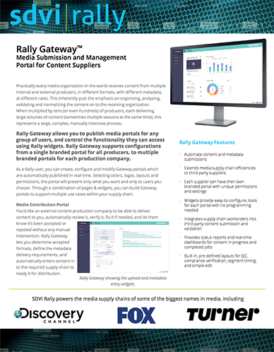 SDVI Corporation was founded on the premise that there is a better way to run and optimize media facilities. Traditional media supply chains consist of specialized third-party applications, and fixed technical resources. Next generation, virtualized infrastructures enable programmable assignment of the compute, storage, and networking resources required to support processing applications. The SDVI Rally media supply chain management platform provides this capability, including advanced analytic tools for optimizing the supply chain. Virtualized supply chains managed by SDVI Rally dramatically reduce time-to-revenue while increasing asset utilization and efficiency. SDVI is a privately-held company, based in Silicon Valley, California, with offices in the US and Europe.