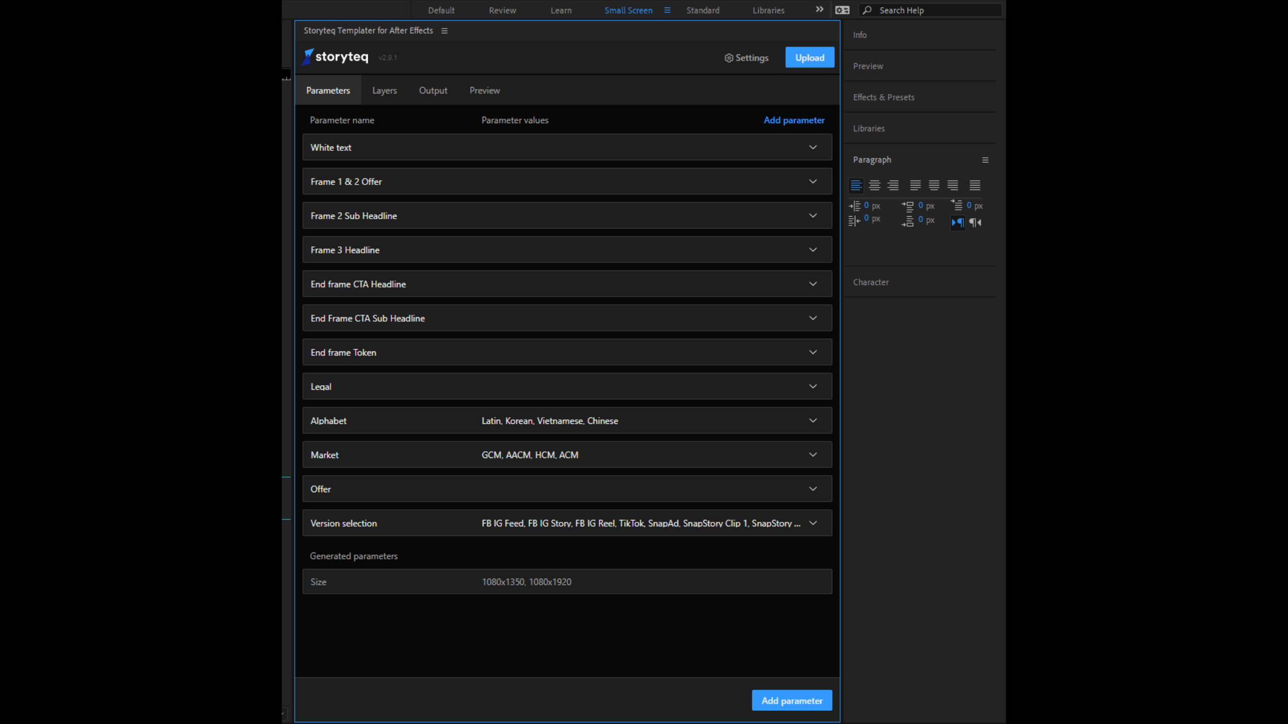 Storyteq Templater for After Effects allows users to convert their AE Project into templates in a native and integrated way, while allowing you to continue your regular way of working, to generate creatives at scale through the Storyteq platform.